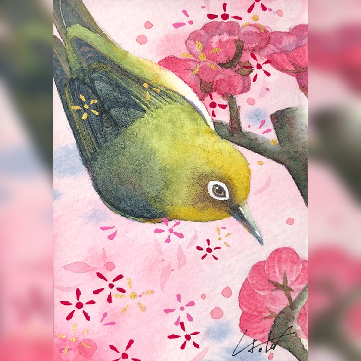 梅とメジロが、爽太さんらしいふんわりと優しく可愛らしいタッチで描かれています❀